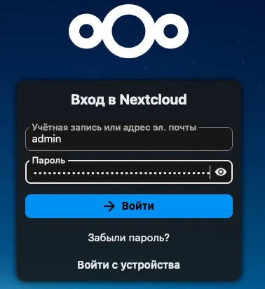 После того как все будет установлено вам предоставят логин и пароль. Нажимаем кнопку Open your Nextcloud и попадаем на страницу авторизации.