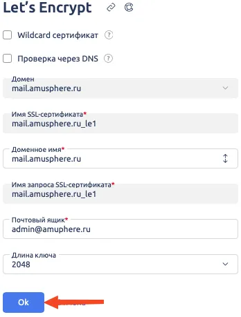 Когда сертификат будет успешно получен, можно приступать к подключению сертификата к почтовому домену.